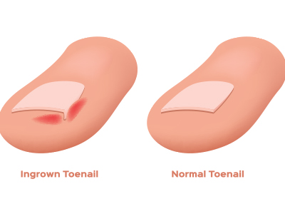 Ingrown toenails are one of the most common conditions we see in our office. The problem is just what its name implies. The nail plate is too large for the under covering or bed and one or both sides are pressing into the skin. Ingrown nails can result from several possible causes such as improper cutting, abnormal nail structure and localized injury to the plate. The appearance of the toe involved may range from a sensitive redness and slight inflammation to a full-blown infection of the toe with pus and bleeding usually evident. The object of course, is to prevent the infectious stage from taking place and to remedy the problem earlier in its development.